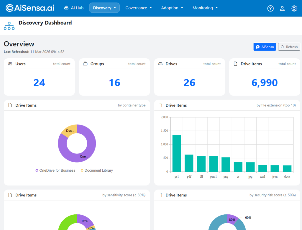 AiSensa analyses Microsoft 365 environments to identify document structures, permissions and potential data risks before AI interacts with them.